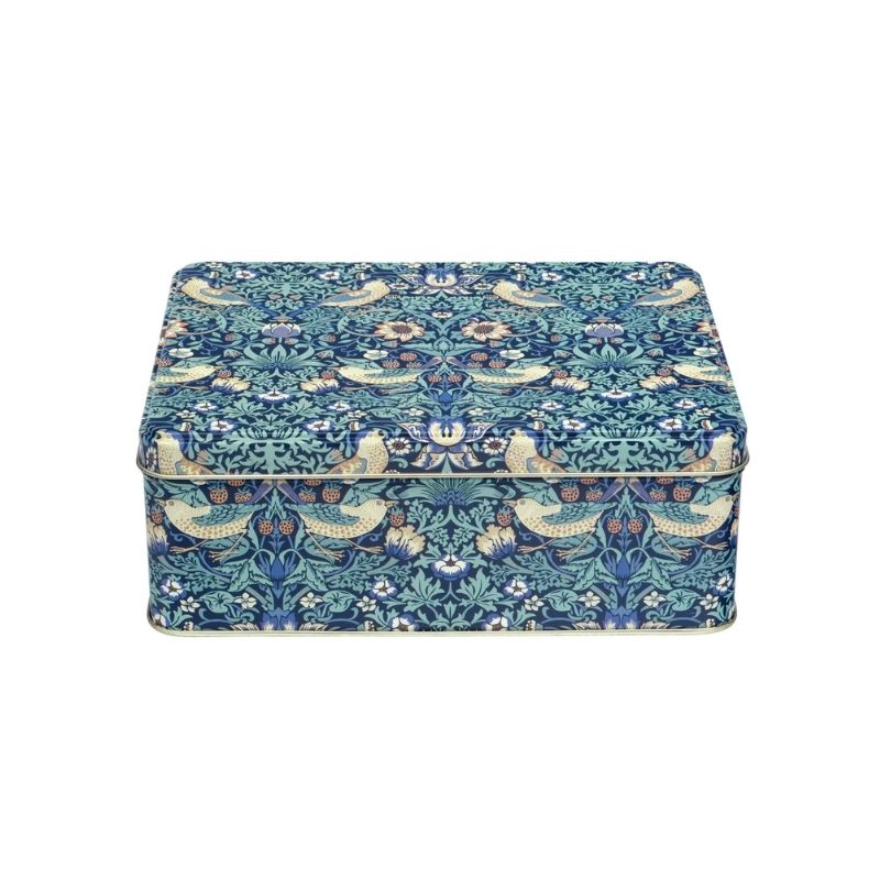 The Arts & Crafts Strawberry Thief Biscuit Tin showcases William Morris's iconic Strawberry Thief pattern with birds, strawberries, and foliage on a rich blue background.