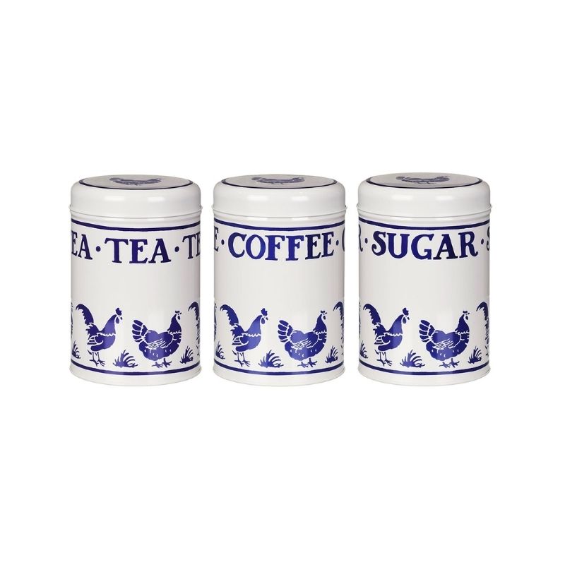The Emma Bridgewater Blue Hens Tin Caddies is a three piece set decorated with hens, roosters, and the words coffee, tea, and sugar.