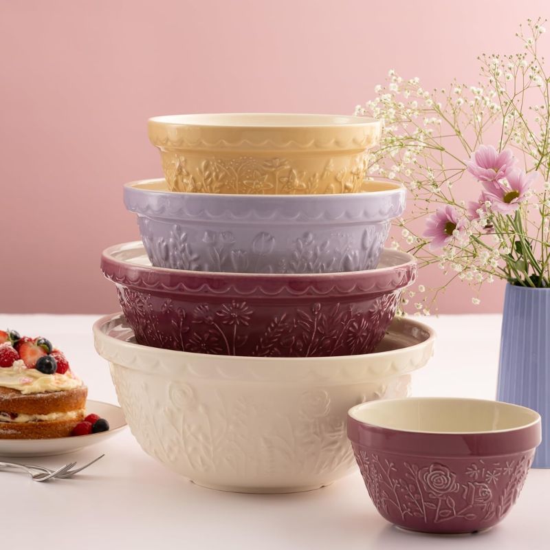 The Mason Cash In The Meadow Purple Pudding Basin is a earthenware bowl designed for steaming puddings and general kitchen prep. The embossed floral exterior provides texture for a secure grip, while the smooth interior helps mixtures release easily after cooking.