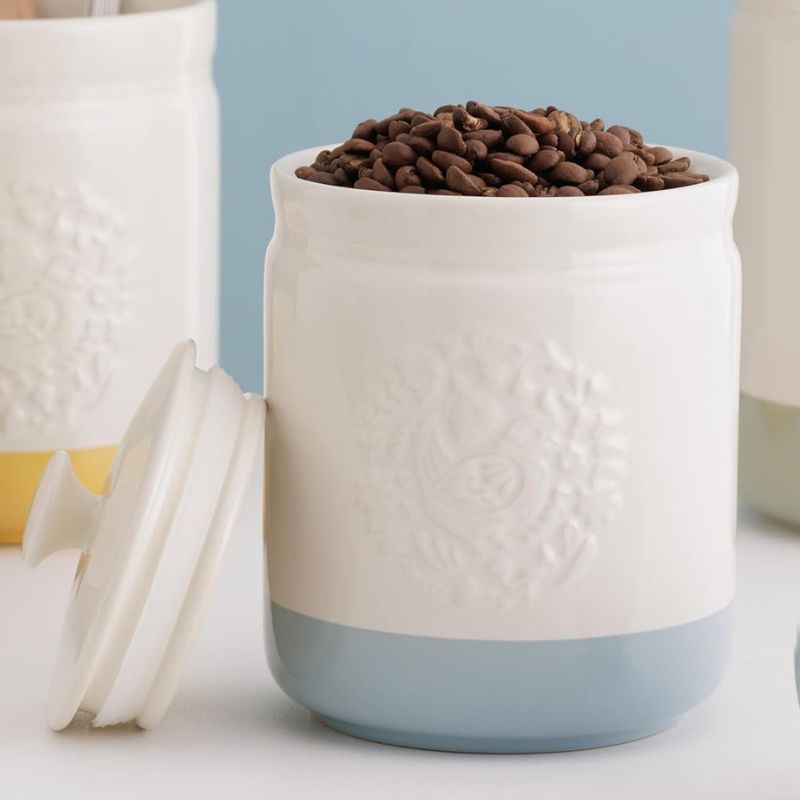 The Mason Cash Home To Roost Storage Jar in Blue is decorated with an embossed hen design and blue trim, which adds a soft pop of colour to your kitchen bench top.