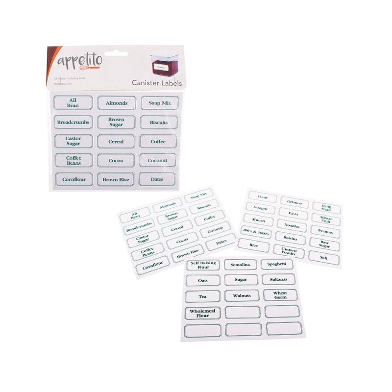 All Bran, Almonds, Breadcrumbs, Brown Sugar, Brown Rice, Biscuits, Castor Sugar, Cereal, Coffee, Coffee Beans, Cocoa, Coconut, Cornflour, Custard Powder, Dates, Flour, Gelatine, Icing Sugar, Lasagne, Mixed Fruit, Muesli, Noodles, Oats, Pasta, Peanuts, Raisins, Raw Sugar, Rice, Salt, Self Raising Flour, Semolina, Soup Mix, Spaghetti, Sugar, Sultanas, Tea, Walnuts, Wheat Germ, Wholemeal Flour, 100s & 1000s & 5 blank labels.